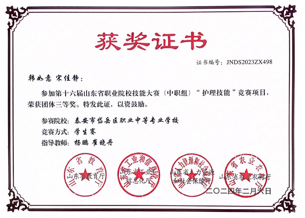 2023年获山东省职业院校技能大赛中职组婴幼儿保育赛项三等奖